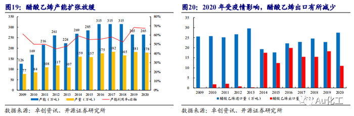 醋酸乙烯产能扩张放缓。根据中国石化报,世界醋酸乙烯超60%产能集中在亚洲地区,而中国醋酸乙烯产能占世界总产能的40%左右,是全球第一大醋酸乙烯生产国家。国际上醋酸乙烯生产分为乙炔法和乙烯法,相较于乙炔法,乙烯法具有经济环保,产品纯度高等特点。由于我国化工行业能源动力主要依靠煤炭,所以目前醋酸乙烯生产以乙炔法为主,产品较为低端。国内醋酸乙烯产能在2013-2016年期间有明显扩张,而在2016-2018年间维持不变。受到国内产能产量变化的影响,自2013年国内产能扩张后,醋酸乙烯产能逐渐过剩,我国醋酸乙烯进口产品逐渐被国产醋酸乙烯替代,醋酸乙烯出口量亦明显上升。2016年蒙维二期装置投产之后,电石法装置产能扩增停滞,2016-2018年中国醋酸乙烯产能维持稳定。2019年中国醋酸乙烯行业仍呈现结构性过剩局面,电石乙炔法装置产能过剩,行业集中度较高。2019年乙烯价格低位,乙烯法醋酸乙烯成本低于电石乙炔法成本,加上EVA产能释放对乙烯法醋酸乙烯需求持续增加,北京东方长期停车的9万吨/年装置重启。据卓创资讯数据,2020年,中国醋酸乙烯产能265万吨/年,同比持平。