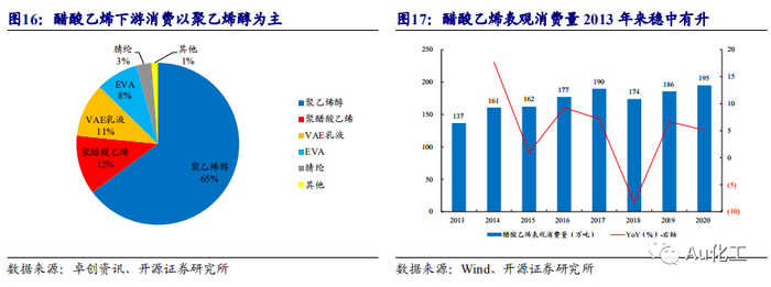 醋酸乙烯主要用于生产聚乙烯醇和EVA。醋酸乙烯(Vac),是饱和酸和不饱和醇的简单酯,可以通过自身聚合或与其它单体聚合,生成聚乙烯醇(PVA)、醋酸乙烯-乙烯共聚物(EVA)等聚合物,得到的聚合物可用于粘接剂、纸张或织物的上胶剂、油漆、墨水、皮革加工、乳化剂、水溶性膜以及土壤改良剂等,在化工、纺织、轻工、造纸、建筑以及汽车等领域具有广泛的应用。根据卓创资讯数据,65%的醋酸乙烯用于生产聚乙烯醇,12%的醋酸乙烯用于生产聚醋酸乙烯。聚乙烯醇和聚醋酸乙烯下游消费产品为聚合助剂、织物浆料、胶粘剂等,而VEA乳液和EVA主要用于生产胶粘剂、涂料等。