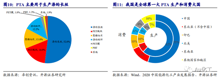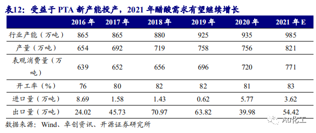 未来PTA产能持续扩张,有望大幅提振醋酸需求。根据卓创资讯数据,自2010年醋酸的表观消费量呈增长趋势,2019年醋酸表观消费量为695.28万吨,同比增长7.07%,自2010年以来的复合增长率为7.86%。2017年-2019年,我国醋酸出口量较高,分别为45.73万吨、70.97万吨、63.82万吨。下游需求方面,根据卓创资讯数据,25.6%的醋酸用于生产PTA(精对苯二甲酸),19.4%的醋酸用于生产醋酸乙烯,18.1%的醋酸用于生产醋酸乙酯。近年来,醋酸衍生品行业格局相对稳定,未来醋酸的需求增速主要取决于PTA的产能增速。根据卓创资讯数据,90%以上的PTA用于生产PET(聚对苯二甲酸乙二醇酯)。PTA的下游需求主要来自涤纶纤维、聚酯瓶片、聚酯切片。其中涤纶长丝对PTA的消费需求最多,占PTA总需求的52%。随着PX-PTA-涤纶长丝产业链的不断扩张,我国已成为全球第一大PTA生产和消费大国,2021年以后,我国投产或拟建PTA产能合计3,490万吨。而生产1吨PTA需要0.04吨醋酸。随着未来PTA不断投产,有望进一步提振醋酸需求。根据我们测算,若未来3,490万吨PTA均能顺利投产,将催生139.6万吨醋酸需求。