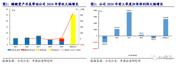 公司原主营业务发泡剂竞争激烈,业务亏损。公司原主营业务为ADC发泡剂系列产品及XPE发泡新材料产品。ADC发泡剂属基础原料化工,处于产业链中低端,技术含量和附加值均不高。根据公司公告,2018年及2019年以来,环保部门加大了环保核查整治力度,ADC发泡剂下游用户需求减弱,市场主要竞争对手持续以低价抢占市场。2018年、2019年ADC发泡剂的产量同比下降,发泡剂业务营收不断下滑,拖累公司2018年归母净利润同比大幅下降,2019年公司归母净利润亏损。2018年公司实现营收4.74亿元,同比下降38.98%;实现归母净利润358.32万元,同比下降95.22%。2019年公司发泡剂业务实现营收2.61亿元,同比下降37.55%;醋酸业务实现营收2.23亿元;公司2019年归母净利润亏损563.72万元。
