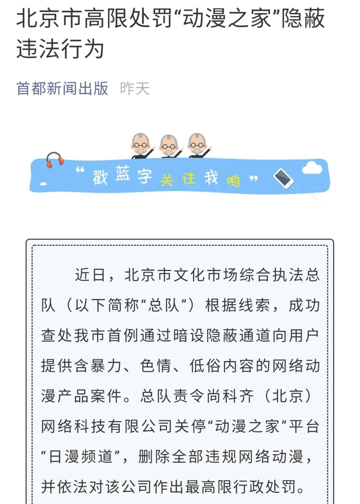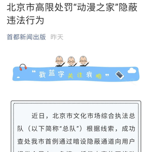 北京市新闻出版局(版权局)官微11日发布《北京市高限处罚‘动漫之家’隐蔽违法行为》。