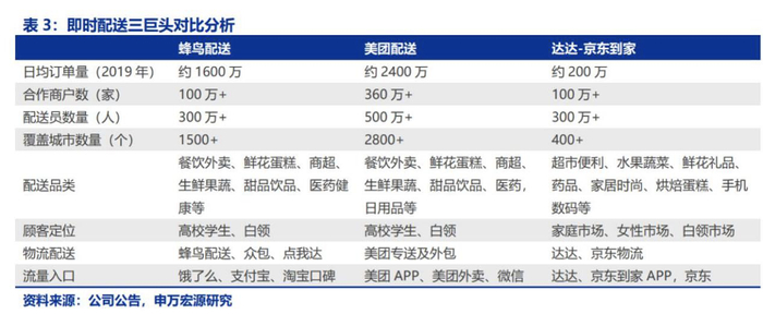 另一位巨头阿里已开始全面布局。2020年3月,阿里全资收购即时物流创始者“点我达”,旗下的即时物流品牌“蜂鸟”也已独立。除此之外,盒马鲜生也成为抢占即时配送生鲜赛道的主力军。