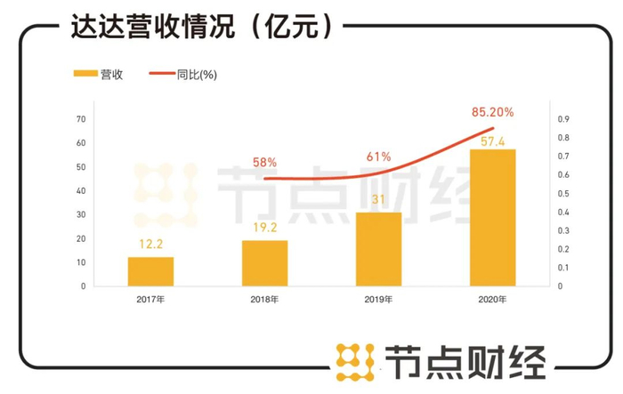 2020年,得益于物流公司的配送订单和连锁商户的城市内配送服务订单增长等,达达即时配送的收入同比增长72%至约34.3亿元;期间,京东到家的收入约为23亿元,其中包括达达为京东到家平台零售商提供配送服务收入9.7亿元以及平台抽佣收入6.9亿元。