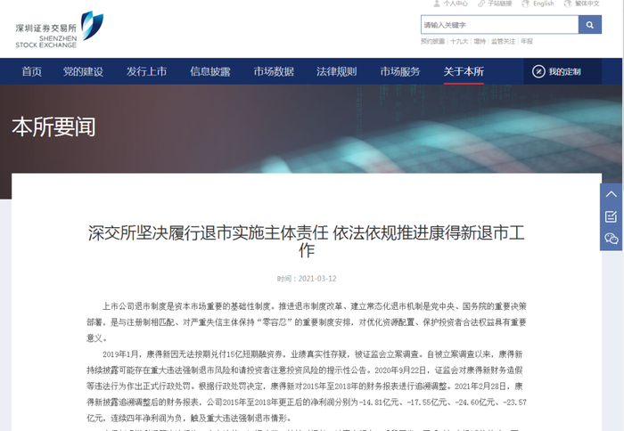 证监会新闻发言人3月12日就康得新退市问题答记者问。证监会新闻发言人表示,将坚决依法依规推进康得新退市,对拖延和干扰康得新退市进程,从而达到其个人目的,进而牟取不当利益的行为,将依法追究相关人员法律责任,维护公开公平公正的市场秩序。