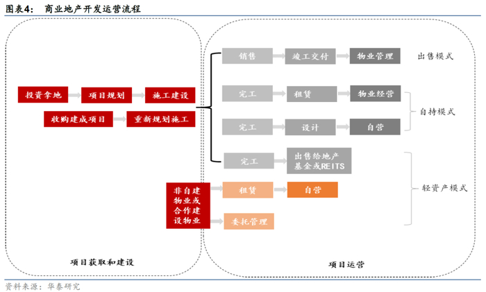 区别于住宅开发后销售去化的单一模式,商业地产按照项目获取及经营方式可分为出售、自持(出租、自营)和轻资产运营三类模式。