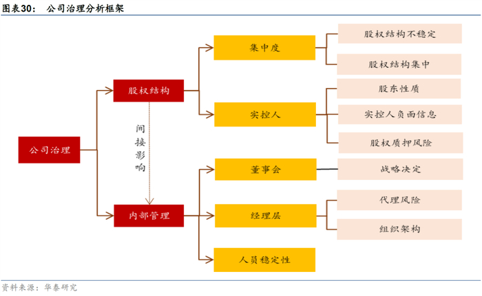 房地产企业的公司治理与企业经营策略及营运能力密切相关。企业的公司治理结构分为两层委托代理关系,即股东与董事会的代理关系,经理层与董事会的代理关系。由于委托代理双方存在信息不对称问题、利益不一致,可能会导致公司治理问题。良好的公司治理结构能有效进行权力分配及资源利用,提升经营业绩及盈利能力并降低违约风险。根据两层委托代理关系,我们从股权结构及内部管理两个角度对地产企业的公司治理进行分析。