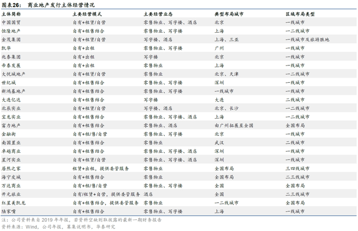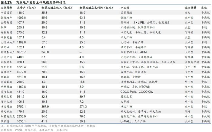 我们通过筛选得到23家主要的商业地产发债主体。我们在衡量商业地产业务比重方面首先考虑租赁管理及酒店占比,然后再补充商业地产销售规模较大,或商业地产业务与住宅业务协同性较强的企业。
