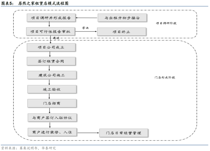 租赁运营模式下,企业租入已建成的项目,经过规划和改造再出租给其他商户,通过租赁费用的价差和收取物业管理费获得盈利。企业前期的资金投入压力较小,后续可通过租金收入获得稳定的现金流。租赁项目运营模式下,租赁成本和租金收入的稳定性取于公司的整体经营能力和品牌效应。代表企业有居然之家,其主要从事家居建材商场业务,截至2020年3月末,公司91家直营门店中租赁店、自有店分别为78家、13家。其中租赁店多与门店产权的实际拥有者签署长期租赁合同,租赁成本维持稳定。