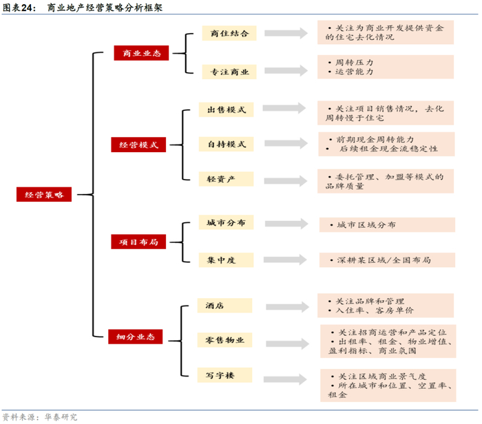 商业地产的主要业态包括零售物业、写字楼和酒店,不同业态的功能定位、经营模式、客户群体、景气度和行业空间均存在差异,分析中考察的核心指标也不同。