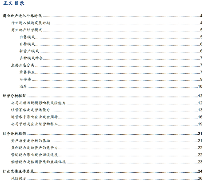 商业地产是我国房地产市场的重要组成部分,本文由行业特征出发,从经营和财务两个视角构建商业地产企业的信用分析框架。我们从规模及品牌地位、经营策略、运营水平、公司管理四个维度分析企业经营能力;从资产质量、盈利能力、营运能力、偿债能力四个方面分析企业财务状况。