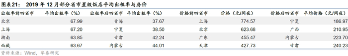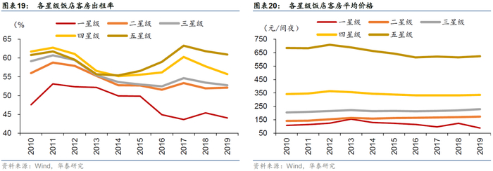 按地域划分来看,不同省市的星级饭店平均出租率和房价表现各异,其中房价的分化更加明显。分别考察2019年末出租率和平均价格位于前四名和后四名的省市,排名水平整体上与经济水平、商务贸易、交通运输、旅游业等相关,例如出租率排名靠前的有北京、上海等省市,排名靠后的有宁夏、甘肃等省市。但也有部分省市存在例外,例如西藏平均出租率63.7%位列第四,但主要由于西藏星级饭店总数较少,同时旅游业相对发达。平均价格比出租率的地域分化更加明显,上海和北京的平均价格在600元/间夜以上;而宁夏、广西等地的平均价格在250元/间夜以下。