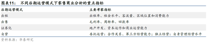其他不同的后期运营模式对应的分析重点也存在差异。采用对外出售模式的零售物业与普通住宅类地产类似,主要考察毛利率、周转率、回款率等情况。证券化模式下要综合考虑企业的地产开发、资本运作和商业运营的能力。对于自营经营来说,委托运营主要考察企业与和第三方合作关系的稳定性、合作方经营水平等因素;独立经营则对企业自身的管理经营水平有着更多的要求。