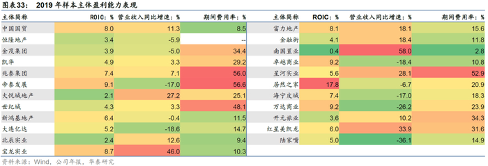 企业的盈利能力是其成本控制能力、经营管理水平、资本运作能力等多重因素的综合体现,也是企业持续运营、获得现金流的保障。营业收入方面,样本企业营收规模差距较大,企业间横向比较意义不大,应更多关注企业自身营业收入规模的稳定性。对于营收波动较大的企业,波动的原因可能是收入确认滞后带来的正常波动、企业快速扩张实现营收增长、经营恶化带来的营收恶化,或战略调整带来的营收变化,需要具体分析。期间费用方面,不同样本企业期间费用率分化,其中部分企业将租赁成本纳入管理费用,对利润造成严重侵蚀,由于期间费用不计入成本,这种会计处理方式会导致利润率虚高。我们选取ROIC衡量样本主体的盈利能力,样本企业ROIC多分布在5%-10%。