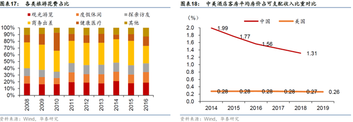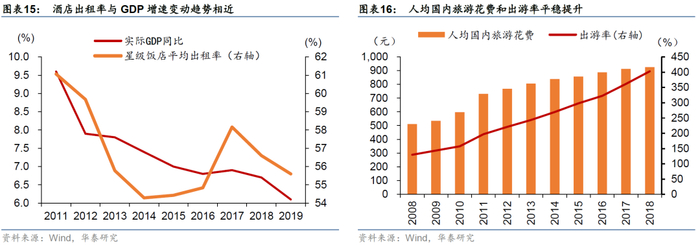 酒店对应着商旅住宿需求,与宏观经济有较强关联,近年来入住率呈下滑趋势。宏观经济运行状况对商务出差、观光度假需求有着显著影响,进而与酒店业态的景气度紧密关联,我国星级饭店平均出租率与实际GDP同比呈现出相近的变动趋势。自2008年至2018年的十年间,我国人均旅游花费由511.0元上升至925.8元,年均复合增速达到6.1%,但近年来增速放缓;出游率(城镇居民或农村居民出游人次数占其人口数的比重)由129.6%提升至402.8%,年均复合增速达到12.0%,人均旅游花费的提升一定程度上带动了酒店物业的景气度,但客房出租率仍呈现下滑趋势。