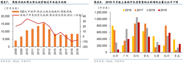 目前零售物业扩张速度放缓,进入存量博弈阶段。零售物业指用于购物、餐饮、娱乐等用途的地产形式,经过粗放式扩张阶段,目前我国零售物业供给结构性过剩,进入了以质量取胜的存量竞争阶段。从主要城市优质零售物业新增供应量来看,多数城市2019年新增供应量比往年下降。