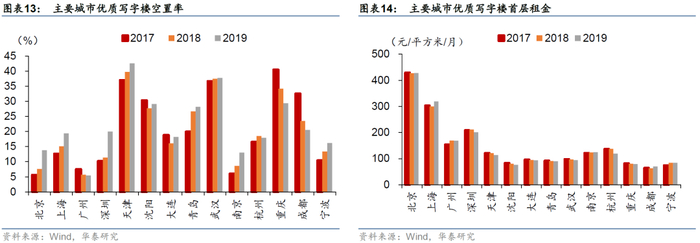 从主要城市优质写字楼空置率来看,地域分化明显,各地空置率走势分化,自2017年以来,北京、上海、天津等城市空置率略有抬升,重庆、成都等地空置率逐年下降;但北上广深等一线城市及南京、宁波等二线城市,空置率始终保持在较低区间,而天津、武汉等地空置率长期高企。从主要城市优质写字楼首层租金来看,近三年各城市租金水平整体保持稳定,城市间分化较大,北京、上海租金水平始终保持在290元/平方米/月以上,大幅领先其他城市;而成都、沈阳等地租金水平始终保持在80元/平方米/月以下。综合来看,写字楼的投资机会主要集中在核心城市,需要警惕位于空置率高、租金低的城市的写字楼物业的经营情况。此外,鉴于写字楼开发企业多数采用深耕某区域的精细化模式,单一集中度风险较高。