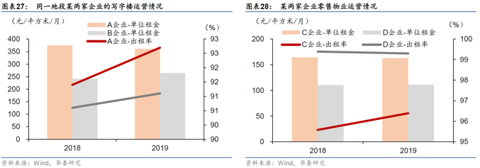 零售物业方面,采用不同产品策略的企业表现更多取决于企业自身规划运营能力。以华润旗下的万象城为代表的高端零售物业项目、以万达为代表的大众项目定位不同,但项目运营质量均较好;而某些企业产品定位与项目规划不相匹配,或经营水平相对有限,导致整体运营情况不理想,例如某企业在二线城市打造高端购物中心,在不理想的业绩下被动调整战略。以C企业与D企业为例,由于数据披露有限,选择的两家企业区域布局不同,C企业位于一线城市,D企业布局城市广泛;C企业的单位租金更高,但出租率较低,单位租金受到地域差异影响难以比较,但所布局区域零售物业景气度相对较差的D企业可以实现较高的出租率,反映出其具备较强的运营实力。