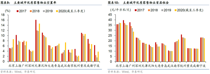 信用资质分析上,对外出租模式下的零售物业运营质量的主要考察因素是出租率、租金水平及租金稳定性。较高且相对稳定的出租率和租金水平可以为企业带来平稳的现金流。从主要城市的零售物业空置率来看,2017-2019年主要城市优质零售物业空置率整体下行,但其中北京、武汉等地的空置率有抬升。截至2020年三季度,受疫情影响,多数主要城市空置率有所上升,其中北京、武汉、天津空置率上升幅度较大;横向比较来看,2017-2019年天津、沈阳、重庆的空置率始终在9.5%以上,需要警惕;杭州、南京等地的空置率维持在较低水平。从主要城市的零售物业首层租金来看,2017年以来多数主要城市优质零售物业首层租金呈现下滑趋势。区域分化明显,北京、上海、广州租金始终维持在30元/平方米/天以上;武汉、重庆、成都则一直保持在15元/平方米/天以下。对于主要布局在重庆等空置率偏高,租金偏低地区的企业,需要关注其出租物业的运营压力。因此,在分析商业地产企业时需要对其重点布局城市加以区分,空置率和租金边际变化相较于绝对值更为有效,例如重点布局武汉的某房企,近年经营水平不佳部分原因也系受到区域商业景气度下滑和空置率上升影响所致。在租金稳定性上,企业通常会根据项目的位置、质量以及市场情况综合运用定价定向、招投标等多种方式确定租金水平。此外,部分企业会根据零售物业的经营收益灵活确定租金,例如帝泰发展旗下的正大广场,租金收入的收取模式为“固定租金和销售额提成两者取高”模式,该模式下企业的租金收入受到经营景气度的影响。