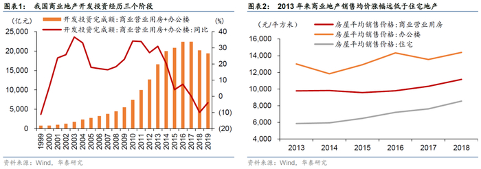 2015至今:低速发展阶段。2015年至今,经济进入新常态、线上消费冲击、前期发展过快导致供给结构性过剩等因素冲击下,商业地产价格涨幅低于住宅。此外,住宅类地产利润空间持续压缩,对商业地产的支持开始下降。行业发展红利期已过,存量博弈阶段下低资质企业逐步出清,资本运作能力成为企业核心竞争力。