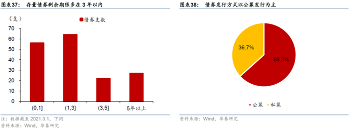 从债券市场存量现状来看,剩余期限多在3年以内,发行方式以公募发行为主。剩余期限方面,0-1年、1-3年、3-5年、5年以上的债券分别有56支、64支、22支、27支,占全部债券比例分别为33.1%、37.9%、13.0%、16.0%,多数债券集中在3年之内到期。发行方式方面,公募发行、私募发行的债券分别占全部存量债的63.3%、36.7%。多数企业债券以公募发行方式为主,但部分企业私募发行占比较高,例如卓越商业的19支存续债券中,16支采用私募发行的方式。