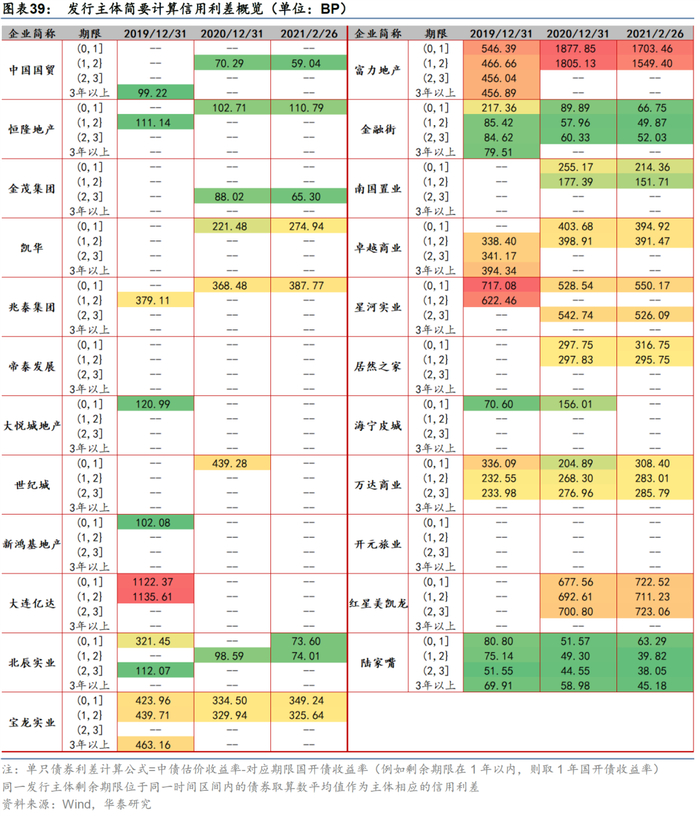 从信用利差来看,不同主体的利差水平分化。中国国贸、金融街等主体信用利差始终维持低位,而大连亿达利差水平高企,始终维持在1000BP以上,富力地产今年信用利差快速走阔,不同期限对应的信用利差均达到1300BP以上。