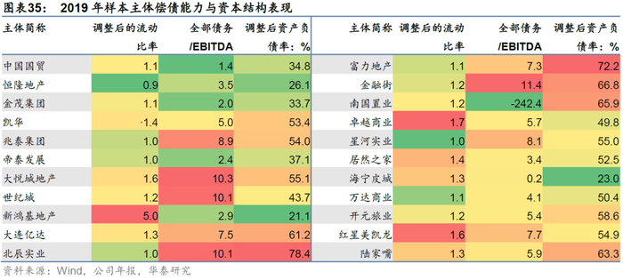 第三,项目布局上,样本企业区域布局多以一二线城市为主,整体项目质量较高。从商业地产项目的区域布局来看,中国国贸、兆泰等企业深耕一线城市;恒隆地产、大悦城地产等企业主要布局一二线城市;大连亿达、南国置业分布以二线城市为主;开元旅业、海宁皮城项目多位于二三线城市;富力地产、万达商业等则是全国布局的典型企业;此外,金茂集团的布局类型包括在北京、上海等一线城市,以及三亚等旅游胜地;而居然之家截止2019年末三四线城市门店占比达到69.9%。一线城市和二线核心城市的商业地产运作较为成熟,需求空间更大,项目质量相对较高;而低线城市长期来看商业地产需求面临下滑风险,去化及未来收益存在不确定性。从布局战略上看,选择区域深耕战略的企业往往在区域内具有一定资源优势和品牌影响力,但需警惕区域经济、政策风险带来的不确定性;全国布局的企业可以扩大规模,平滑区域风险,但管理难度加大,存在一定的成本控制压力,未来潜在支出规模较大。
