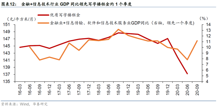 写字楼主要需求是金融、IT等行业,而这些行业主要分布在一线城市,因此不同能级城市写字楼业态的表现差异较大,经营模式上多数为出租,需关注空置率和租金水平。金融、IT等均属于知识密集型行业,而一线城市人才资源丰富,经济发展及配套设施完善,因此大型金融机构和互联网公司多集中在一线城市,例如北京的金融街、上海的陆家嘴是典型的金融中心;北京的中关村、深圳的南山科技园聚集了大量的优质互联网公司。金融+信息技术行业GDP同比领先写字楼租金约1个季度。由于办公需求相对其他业态更具刚性,且政策调控较少针对写字楼项目,因此行业景气度波动性较小,受到外部冲击影响相对较小。