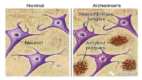 它有两个典型的病变,即神经纤维缠结和Aβ蛋白的沉积。如图所示,我们看到里边神经纤维发生了缠结,这个细胞的外面会有Aβ蛋白的沉积,也被称为脑里面的老年斑。