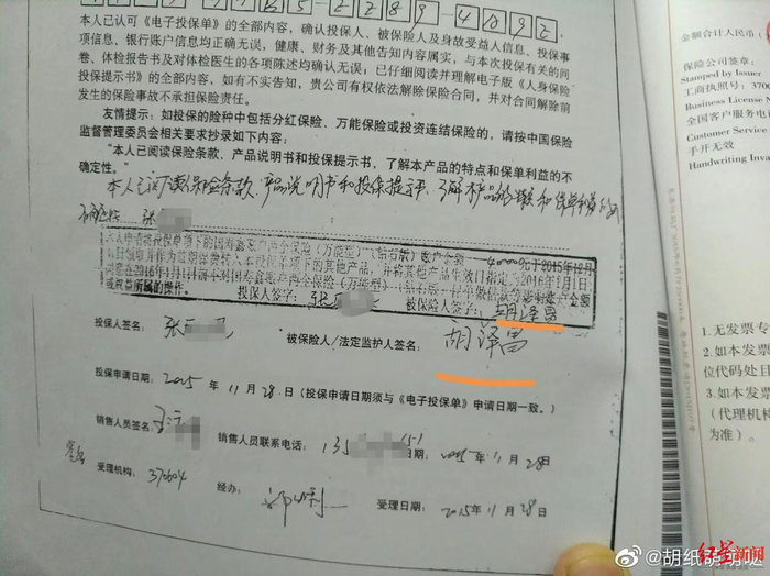 这封实名举报信要从2015年的一份保单说起。2015年11月28日,胡泽昌的母亲在他人的介绍下,为胡泽昌购买了一份中国人寿鑫福年年保险产品。
