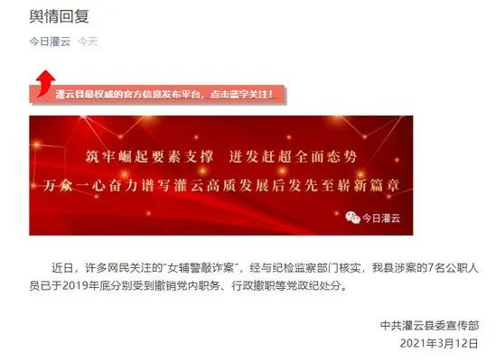 据江苏灌云县委宣传部12日消息,近日,许多网民关注的“女辅警敲诈案”,经与纪检监察部门核实,灌云县涉案的7名公职人员已于2019年底分别受到撤销党内职务、行政撤职等党政纪处分。