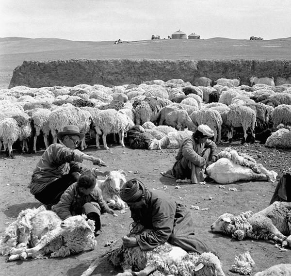 20世纪60年代的内蒙古锡林郭勒盟巴彦锡林人民公社,社员们在草原上剪羊毛。新华社发