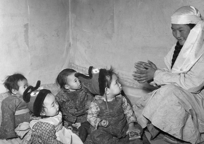 内蒙古巴音策勒牧业社的保育员和幼儿们玩耍(资料照片)。新华社发