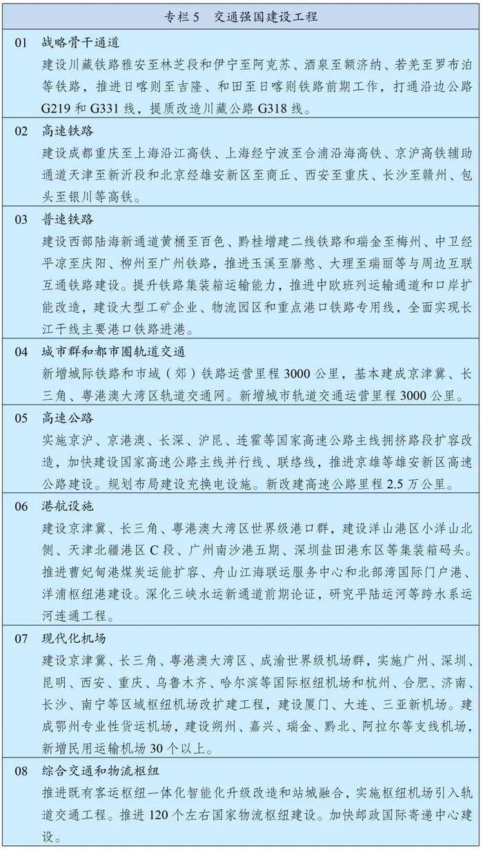 构建快速网,基本贯通“八纵八横”高速铁路,提升国家高速公路网络质量,加快建设世界级港口群和机场群。
