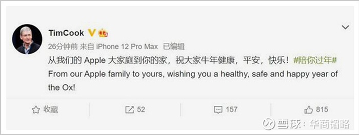 库克还在中国开通了自己的微博。今年春节,他通过微博祝福大家“牛年健康,平安快乐”。