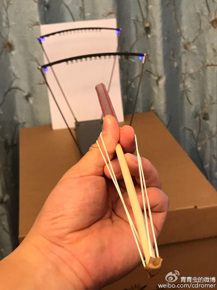 单说1.8焦耳/平方厘米可能很少有人能拥有一个直观的概念,所以微博上就有人专程做了一个测试。在这次测试中,博主@青青虫 用了两根橡皮筋、一根一次性筷子和一根可乐吸管组成了一个简易发射器。