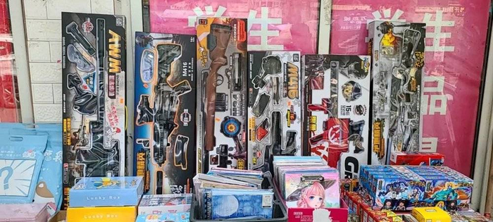 入目看去,这家小卖部虽然打着学生用品的旗号,但在门脸最前方的核心位置上摆放的却都是各种各样的玩具。其中有6把玩具枪就被摆放在最显眼的地方。