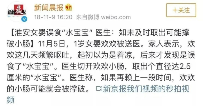 除了生产材料的可能不合规之外,玩具枪通常还配有许多细小的部件,例如各种瞄准的配件、水弹等等。2018年11月,新闻晨报就曾有报道,有1岁女婴因误食水宝宝(即水弹枪的水弹)而被送医。