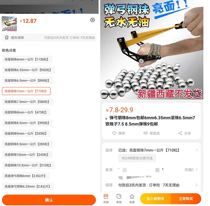 此后,我们曾在网上搜索BB弹,却没有发现售卖相关产品的店铺。但同时,我们却发现有售卖和BB弹相同大小的钢珠。按淘宝的配图,这种钢珠是用来做弹弓子弹用的,价格也十分便宜,只需要11.5元,就能买到750粒,而且还包邮。