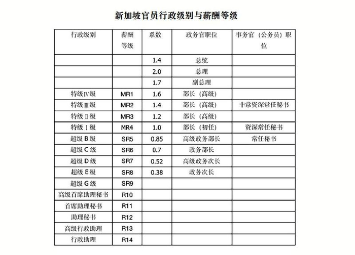 新加坡官员薪酬制度有三个突出特点。一是官大于吏。官就是政务官,包括总统、总理、部长等,经由选举产生。这部分官员实属精英,确实少而精,在新加坡也就30来人。吏就是事务官,或官僚阶层、公务员,经由人力资源市场聘用而来。所谓官大于吏,体现在薪酬等级表中,就是政务官的工资一定高于公务员。