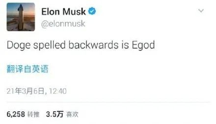 3月5日,马斯克又发布推特称,“Doge(狗狗币)的拼写反过来就是Egod(意为电子上帝)。”