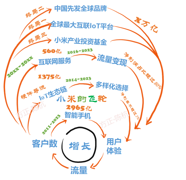 我们基于亚马逊原始飞轮的核心思想,借鉴该理论从三大业务板块、四个层次构建小米成长的飞轮模型。