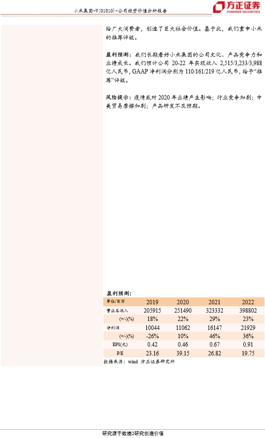 盈利预测:我们长期看好小米集团的公司文化、产品竞争力和业绩成长。我们预计公司20-22年实现收入2,515/3,233/3,988亿人民币,GAAP净利润分别为110/161/219亿人民币,给予“推荐”评级。