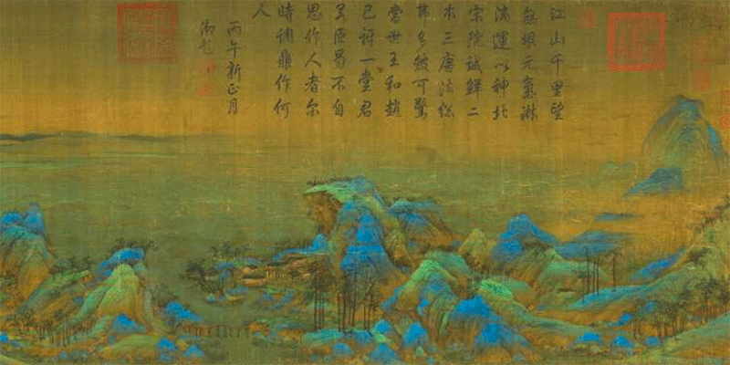 由北宋画家王希孟所画,创作它时,王希孟仅18岁,受皇帝徽宗亲自传授,不到半年时间绘就。