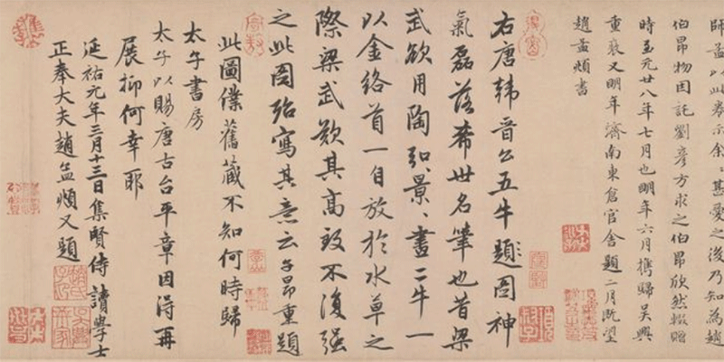 它是唐代画家、宰相韩滉的传世孤本,创作至今1200年,有赵孟頫、孙弘、项元 汴、弘历、金农等十四家题记。