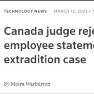 (观察者网讯)据路透社13日报道,当地时间3月12日,加拿大不列颠哥伦比亚省最高法庭法官做出裁决,驳回了华为公司副董事长、首席财务官孟晚舟在引渡案中采用华为员工证词的请求。