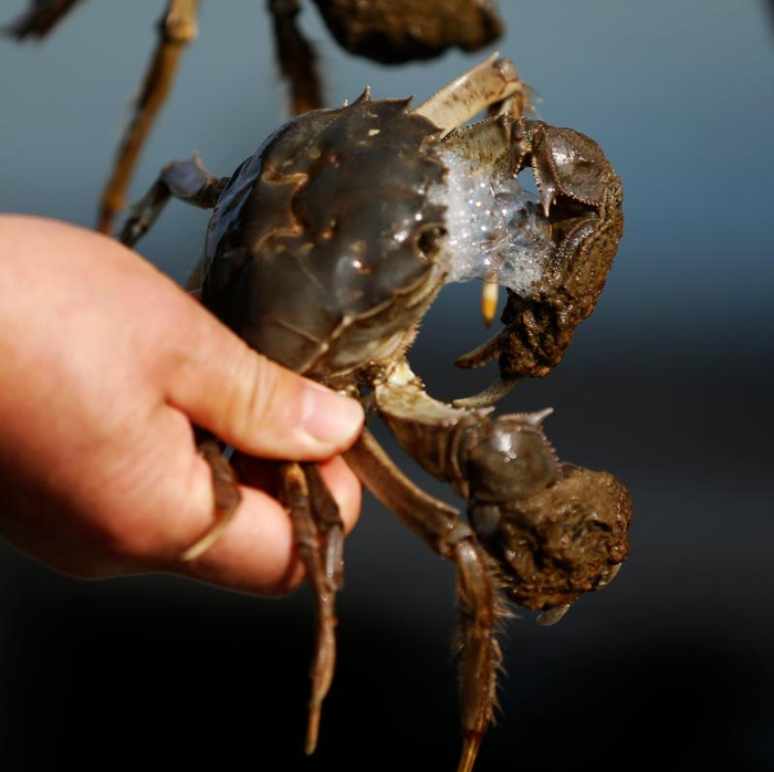 立秋过后,白露降,寒蝉鸣,与这个物候最应景的应该是螃蟹。从它身上也诞生了一种传统色叫“素綦”。“綦”在甲骨文里,上部的“其”是一只鞋的形象,下部是“丝”,指古人系鞋的带子,用在祭祀等典礼上以表庄重。具体的颜色是青黑色,古人还用来形容鹿的皮毛色,如今也可以联想为蟹青色,黑里透着青,又带一点点绿,油亮亮地闪着光。