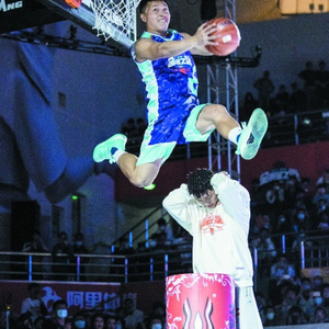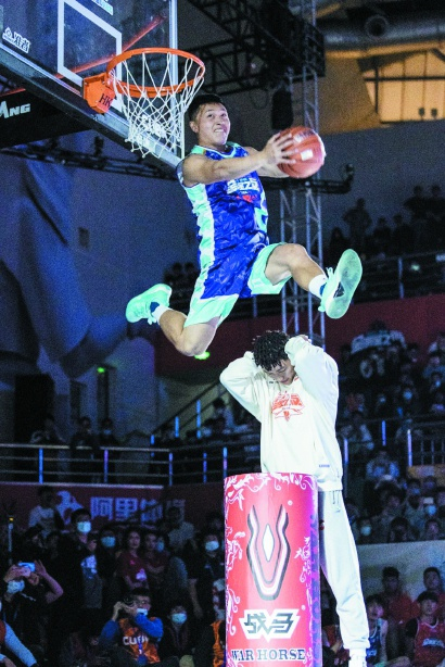 在动感的音乐和酷炫的音效之下,现场观众热情高涨,也激起场上球员的表现欲。在最吸引人的扣篮大赛中,有“中国戈登”之称的来自郑大体院的杨浩,第一个扣篮动作就拿出了高难度的跨人扣篮,而且还有一个空中风车的动作,5名评委也都给出了10分,他拿到第一个满分50分。随后,杨浩又飞跃5人扣篮成功,这个超高难度的扣篮也再次为他拿到满分,实际上,他已经提前夺冠。不过扣嗨了的杨浩没有满足,他又为现场观众表演了一个更加有观赏性的扣篮,这个动作复制了当年NBA扣篮大赛中著名扣将戈登的一个经典动作,他身披斗篷空中转身单手捞球扣篮,仿佛超人归来。