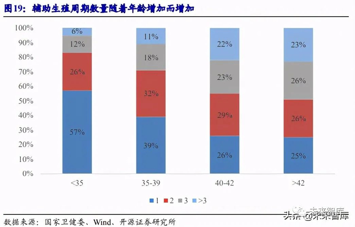 根据上文的测算,人工授精单周期平均价格为 0.5 万元,IVF 单周期平均价格为 3.5 万元。根据对 8 个国家的生育专家的调查,中国 50 个生育专家表示辅助生殖周 期数量随着女性年龄增加而增加,小于 35 岁的女性做超过 1 次周期以上的比例为 43%,但 35-39 岁的女性的对应比例达到了 61%,40-42 岁的女性对应比例达到了74%,由于 IVF 较人工授精治疗更普遍,按 IVF 来算,2 次周期则达到了 7 万,价格 昂贵。在我国并没有设置辅助生殖医保的情况下,商业保险可以降低患者由于辅助 生殖失败带来的较大经济压力,扩大服务半径,从而增加渗透率。