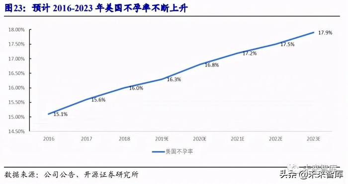 美国本土不孕率上升,对辅助生殖服务的需求日益增长。由于不孕率上升,2017 年,美国不孕夫妇数目已超过 400 万对,预期将继续增加。与此同时,越来越多并无 不育问题的夫妇转为寻求辅助生殖服务(如 LGBT 夫妇)。
