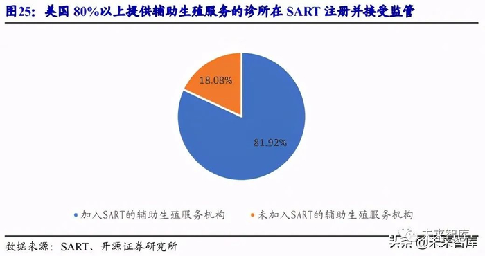 美国生殖医学协会制定发布行业准则,并监管辅助生殖行为。美国生殖医学协 会( American Society for Reproductive Medicine,ASRM)是具有世界级影响力的辅助 生殖行业协会,其附属组织为美国辅助生殖技术协会( Society For Assisted Reproductive Technology ,SART)。ASRM 与 SART 协作监管各机构辅助生殖行为, 具体分工上,ASRM 负责制定行业道德和实践指南,SART 负责严格监控成员所在的 诊所是否遵守美国生殖医学协会实践指南、其胚胎学实验室是否被认证、是否进行 资格审查以及是否将数据提交美国疾病控制与预防中心。目前,美国 80%以上提供 辅助生殖服务的诊所在 SART 注册并通过 SART 进行成功率上报,未能加入 SART 的 辅助生殖机构通过全国人工生殖监控系统(National ART Surveillance System ,NASS) 向 CDC 直接上报成功率信息。